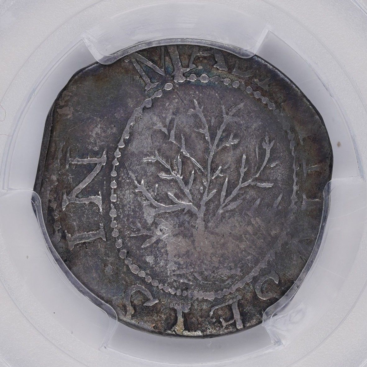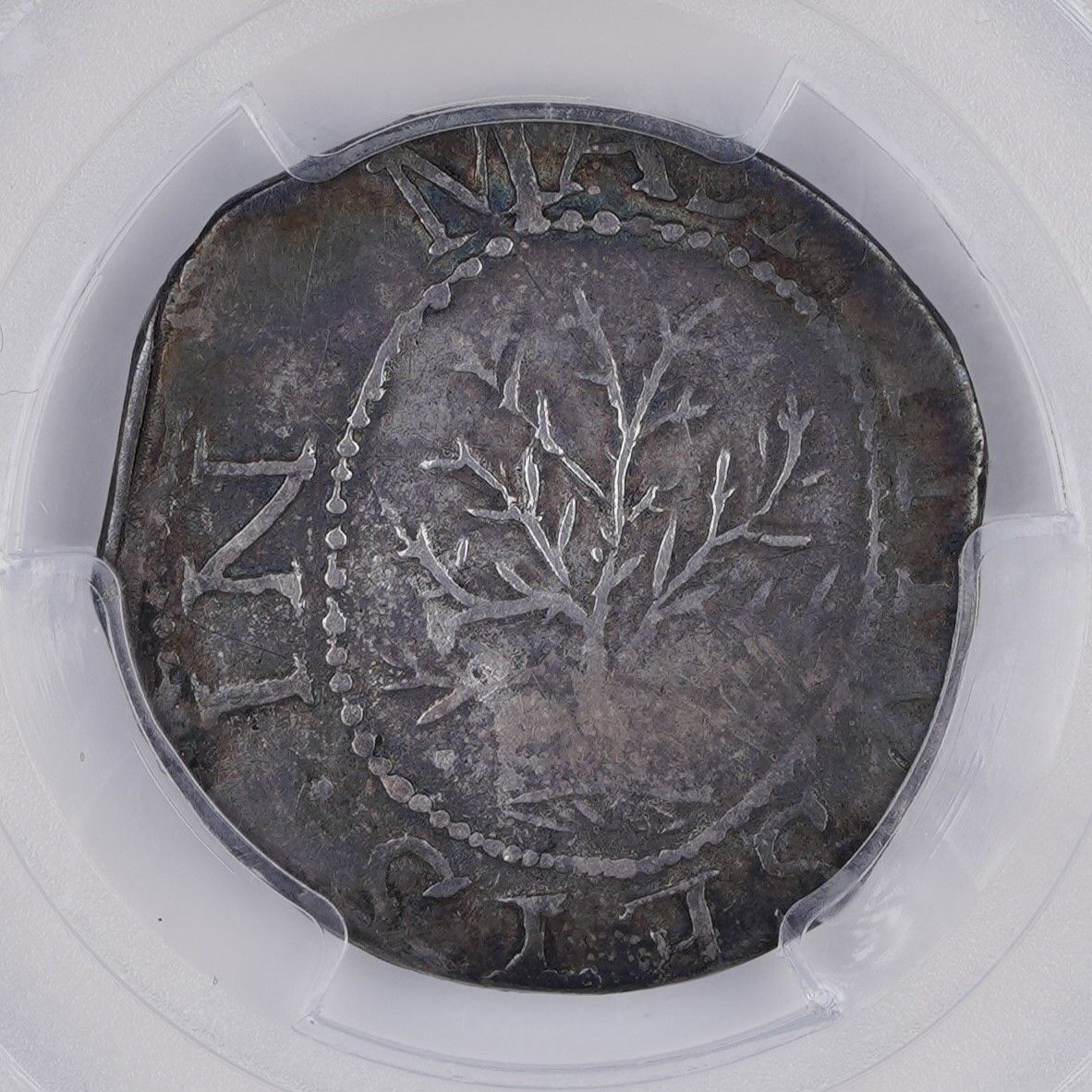 The all-important Noe-1 variety of the Oak Tree shilling is a favorite amongst collectors and enthusiasts of Massachusetts silver
