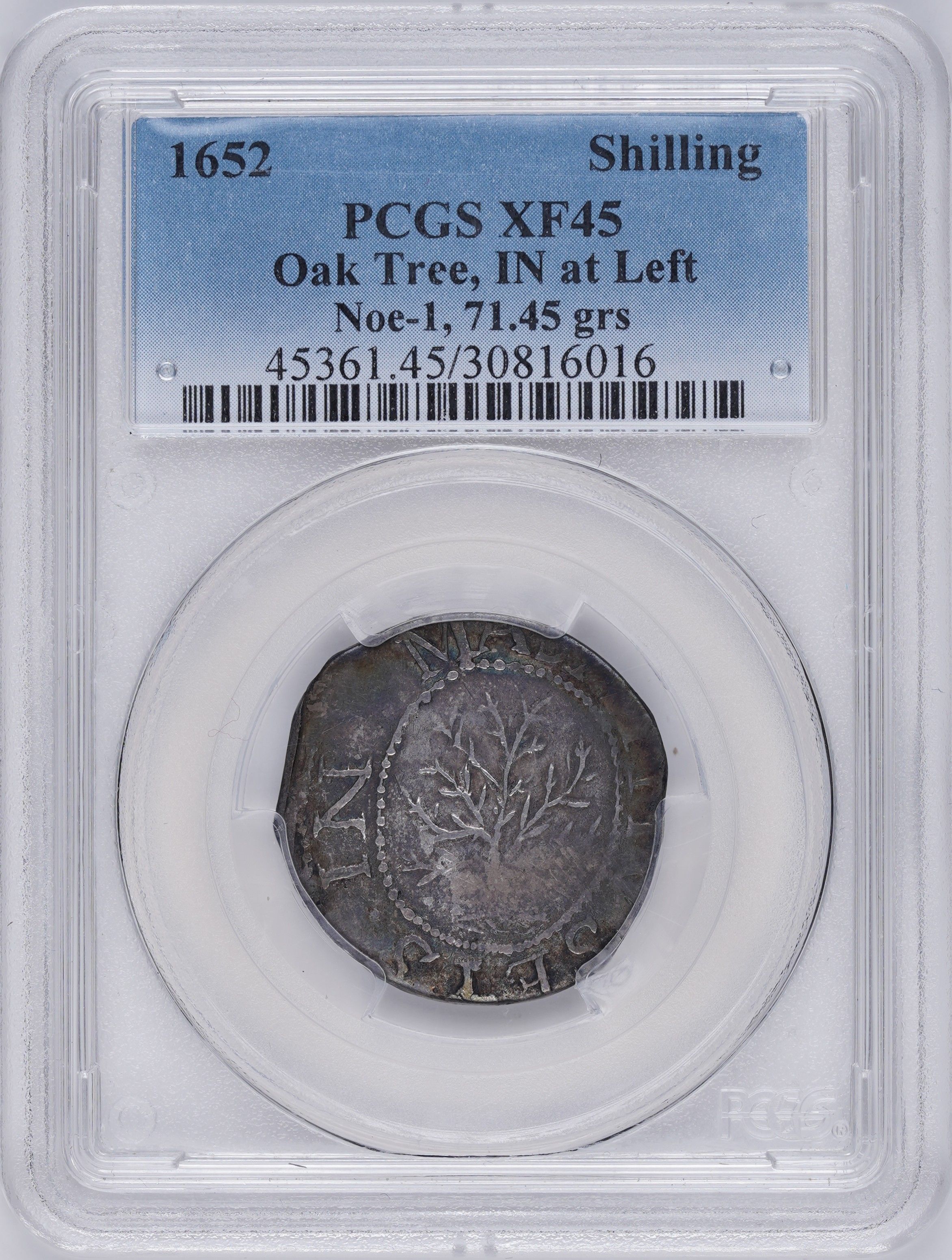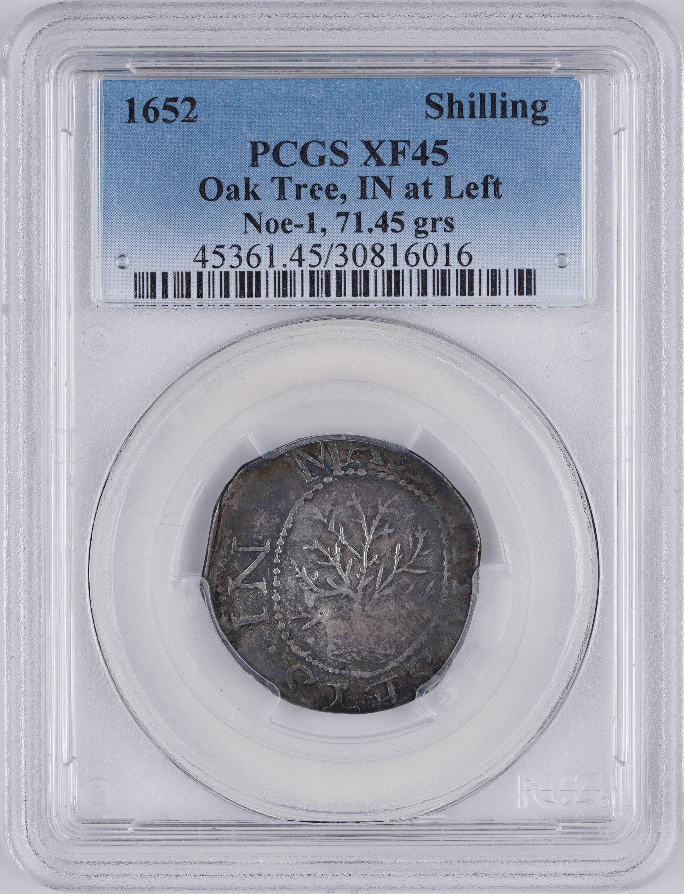 1652 Shilling, Oak Tree, IN at Left Noe-1, 71.45 grs PCGS XF45