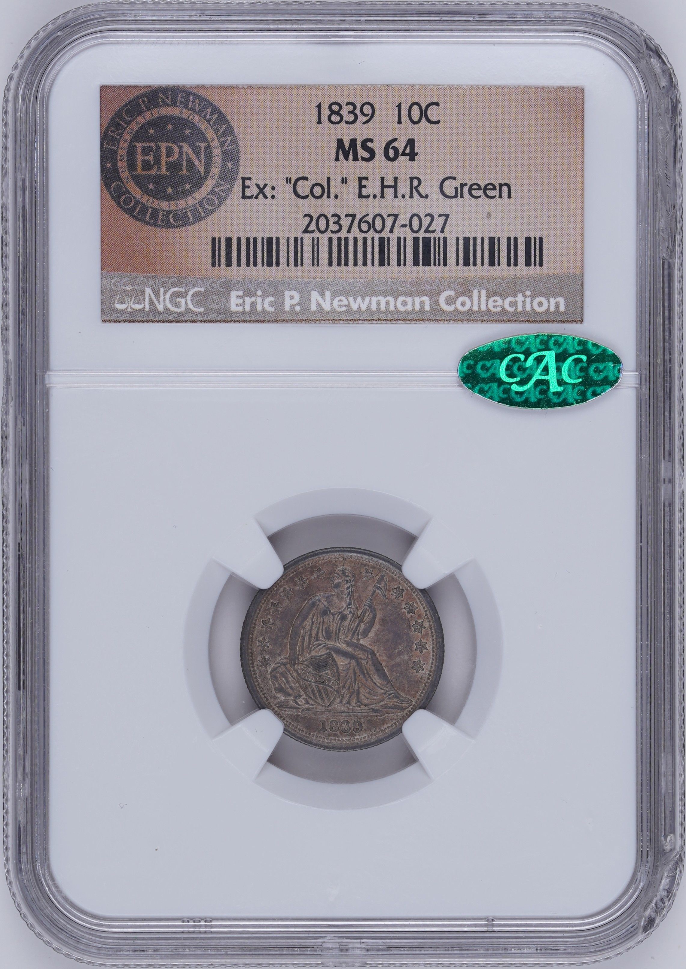A tough coin to find with CAC sticker, this 1839 10C No Drapery Dime has a particularly matte-finished patina and was a part of both the famed Col EHR Green collection and then subsequently owned by Eric P Newman. You could be next.