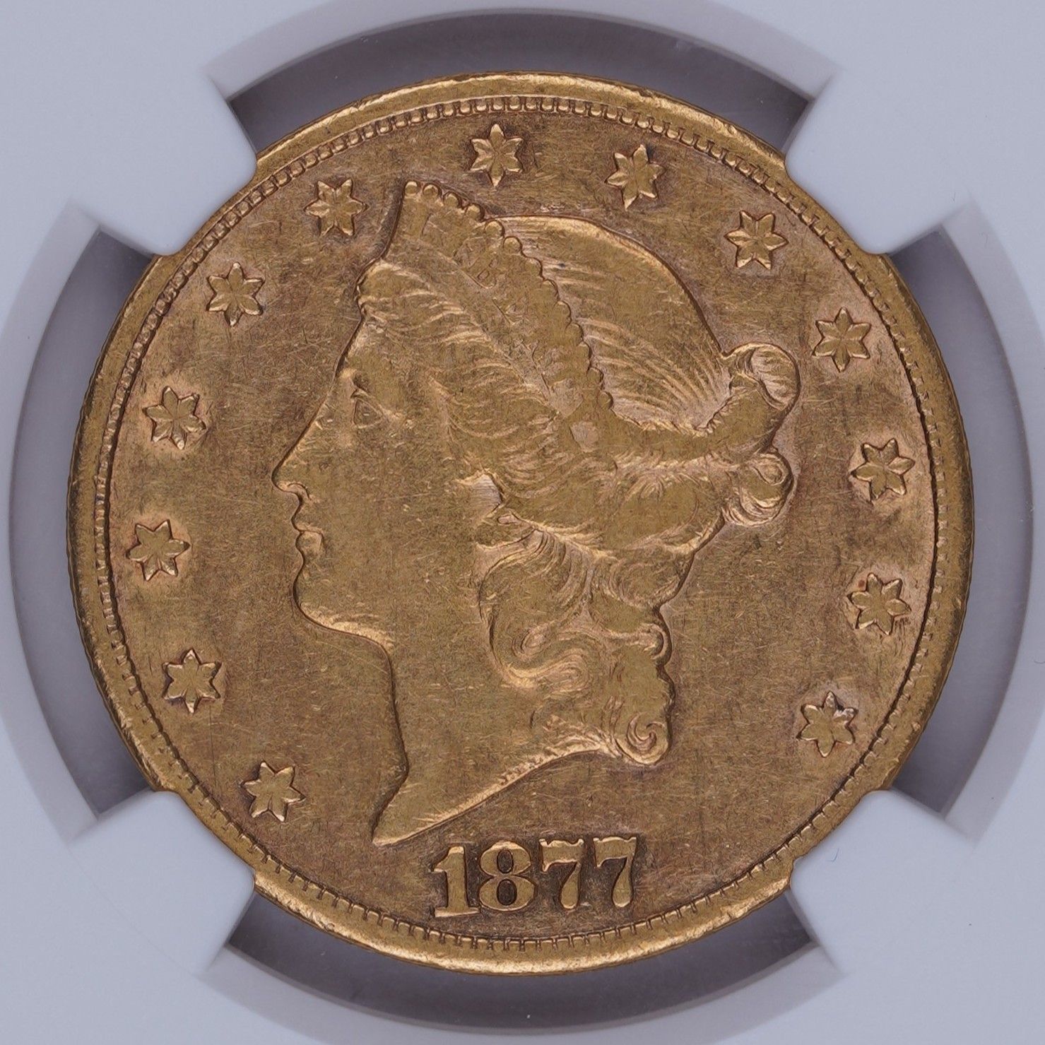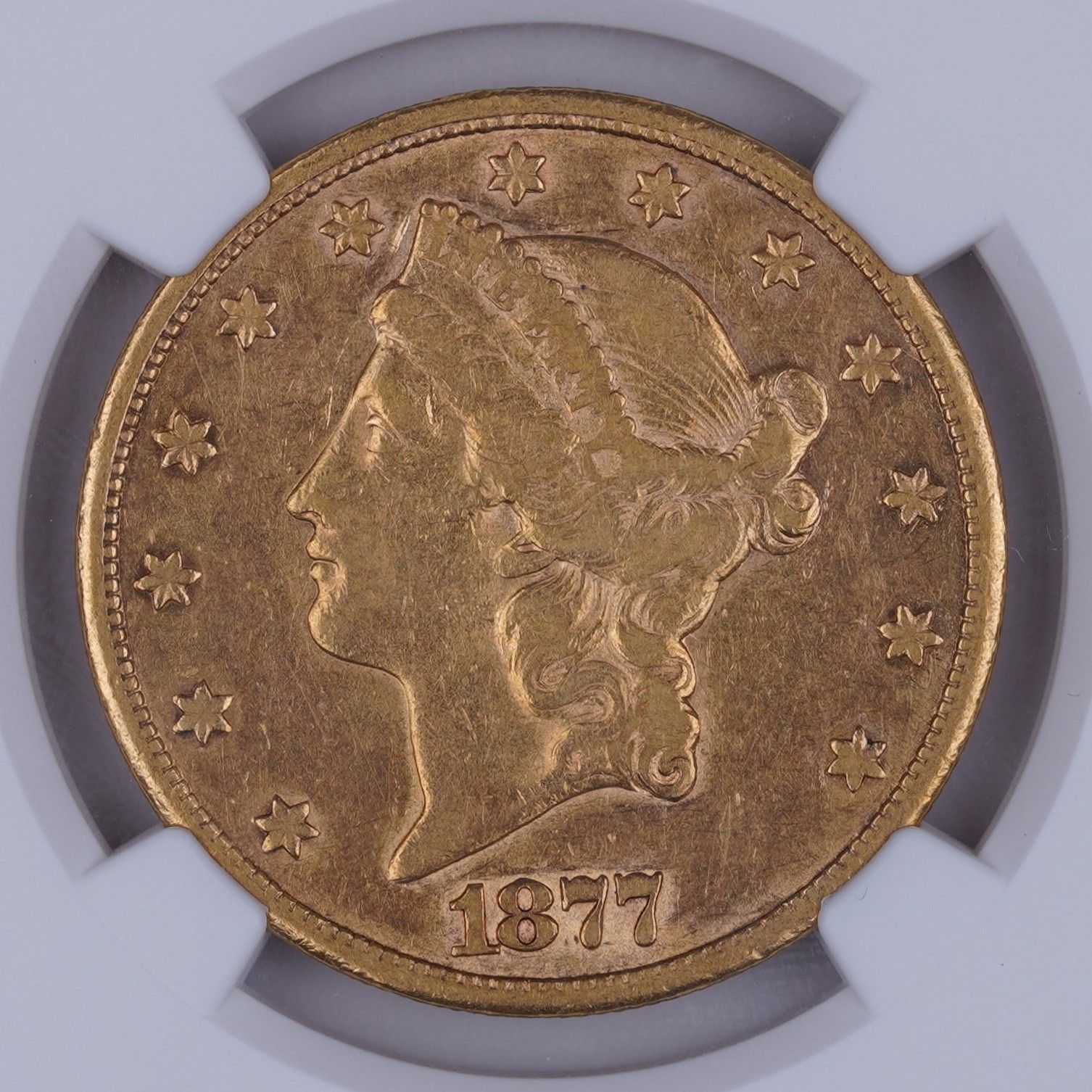The 1877 is a tough date for the Carson City Double Eagle. This gets prohibitively expensive in upper AU grades. That said, here's an accurately graded NGC example that has great eye appeal and is less cost. A nice piece for long-term value.