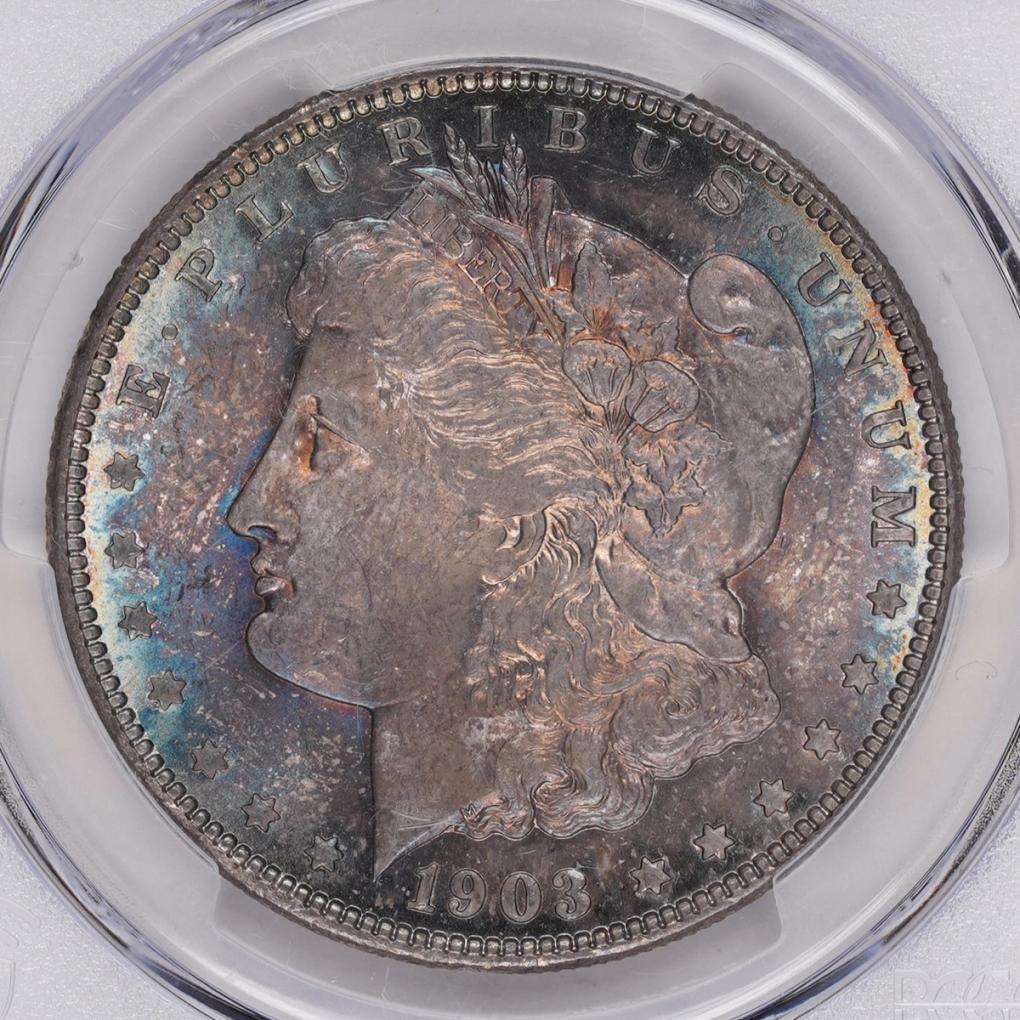 The 1903-O $1 used to be a major rarity in US coins, up until when they found a couple bags of them at the US Treasury. What we were blessed with were coins like this one where reaction with sulfur in the burlap bags created beautiful colors on the coins. This coin has plenty of flash and pop.